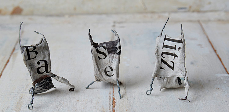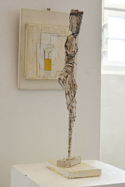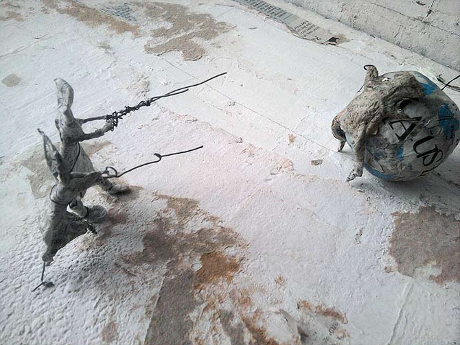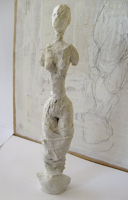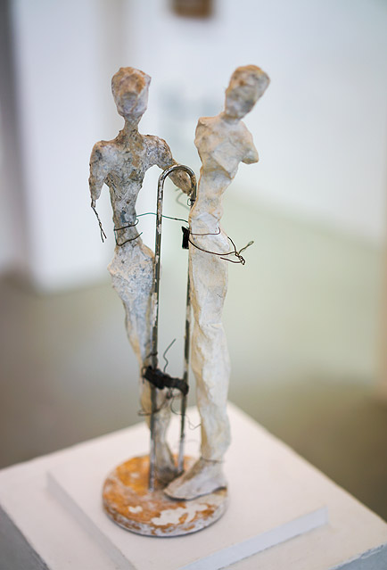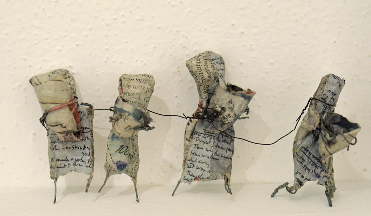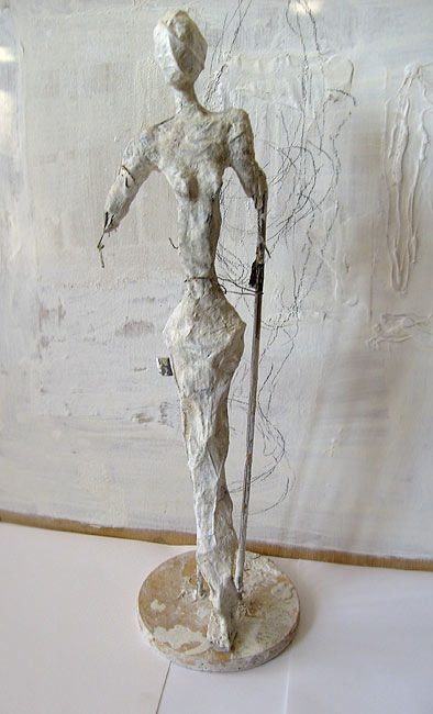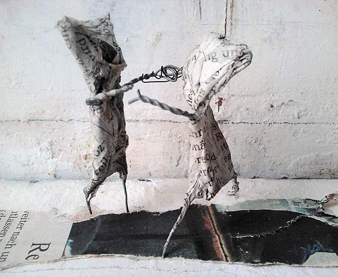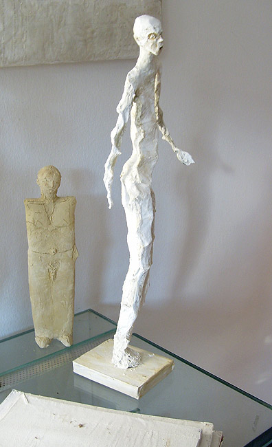 Skulpturen aus Gips, Pappmaché, Draht und Arboceel. In diesen Figuren lote ich die Grenze aus - zwischen Puppe und Mensch. Sie behaupten sich im Zwischenraum zwischen Standbild und Marionette.
